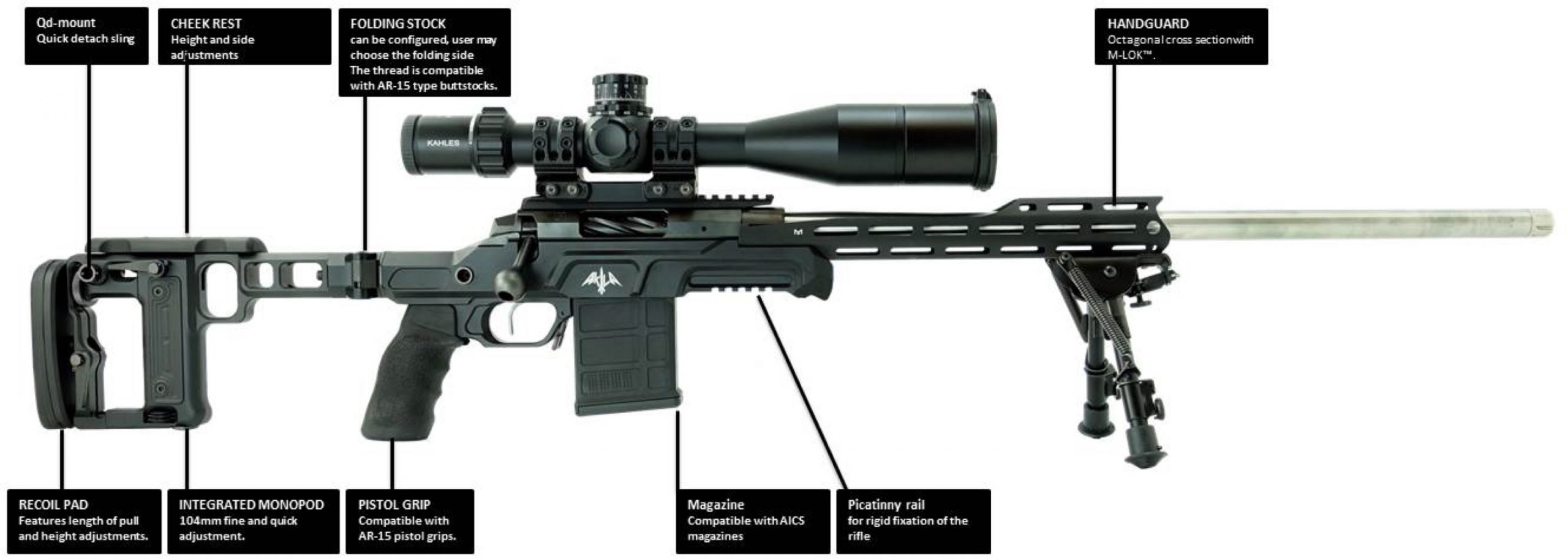 Both AKILA buttstocks are machined out of 7075 T651 aluminium billets and have a black hard coat anodized finish and features QD sling swivels sockets on both sides. Both buttstocks offer a possibility to adjust the cheek piece height and side, the length of pull, recoil pad height. Besides that Buttstock M features a built-in quick deployable and fine adjustable monopod and buttstock Lite has one MLOK™ slot to mount a monopod or a custom bag rider. The buttstock mounting point of the AKILA chassis is compatible with AR-15 receiver extensions, which will allow installing AR butt stocks. The buttstock folding can be user configured and folds to left or right sides of the chassis.