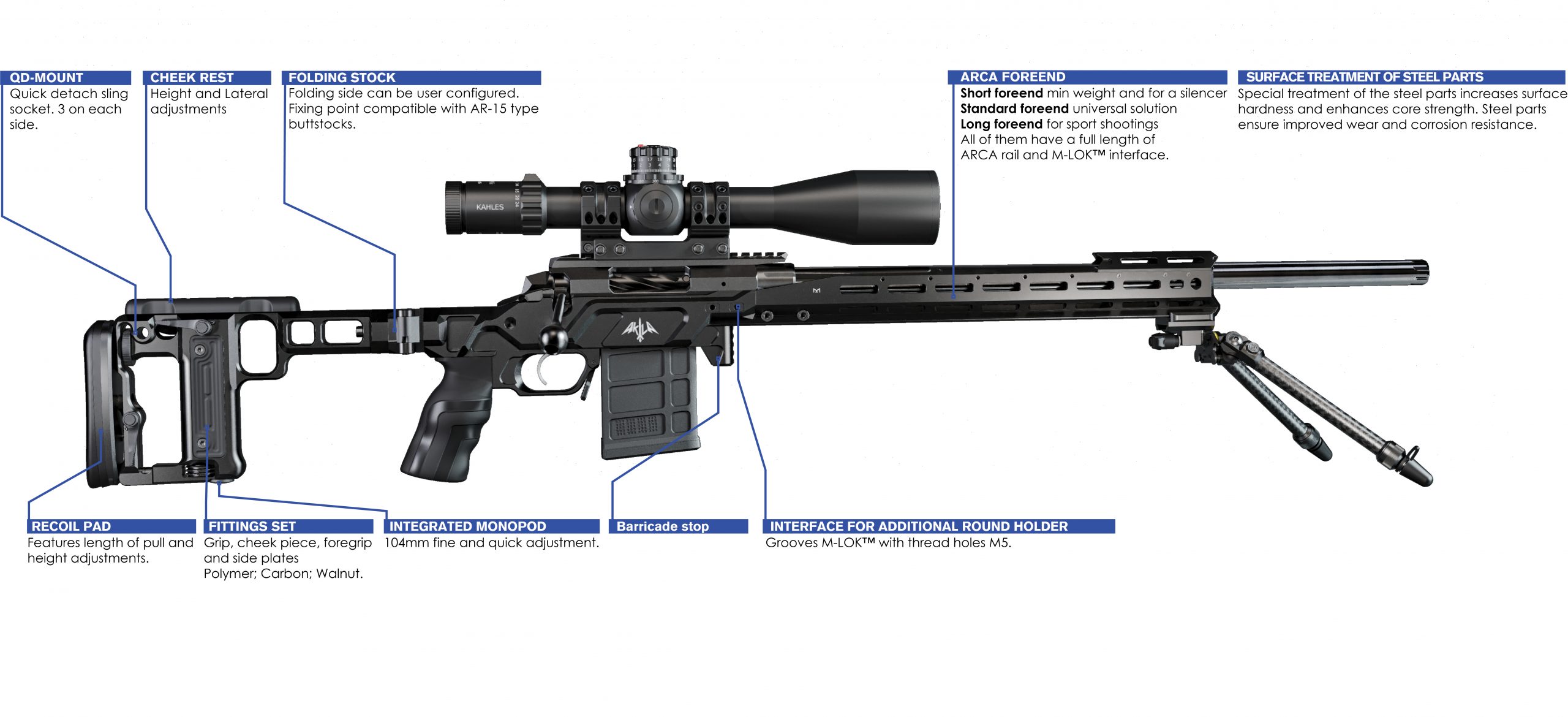 ACSR700 Gen.2. is machined out of 7075 T6 aluminium black hard coat anodized finish and features QD sling swivels sockets on both sides above the pistol grip. The fittings (grip, central part cover, cheek piece, buttstock side panels) are optionally made of walnut wood, polymer (synthetic) or composites (carbon).