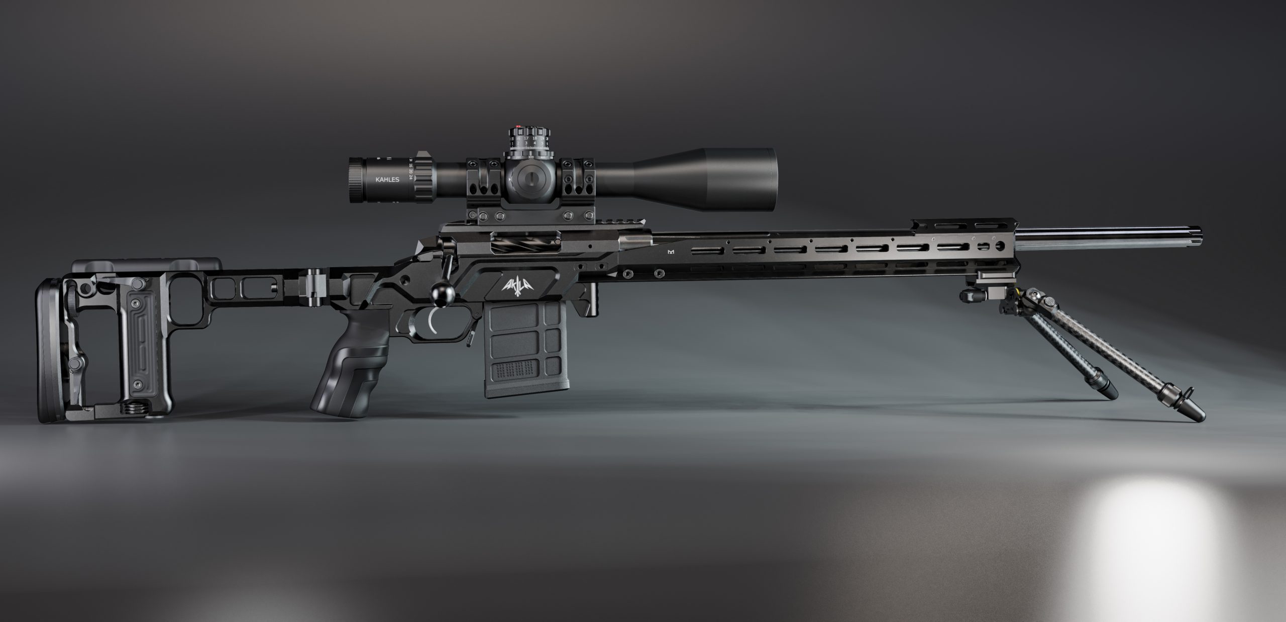 Both AKILA buttstocks are machined out of 7075 T651 aluminium billets and have a black hard coat anodized finish and features QD sling swivels sockets on both sides. Both buttstocks offer a possibility to adjust the cheek piece height and side, the length of pull, recoil pad height. Besides that Buttstock M features a built-in quick deployable and fine adjustable monopod and buttstock Lite has one MLOK™ slot to mount a monopod or a custom bag rider. The buttstock mounting point of the AKILA chassis is compatible with AR-15 receiver extensions, which will allow installing AR butt stocks. The buttstock folding can be user configured and folds to left or right sides of the chassis.