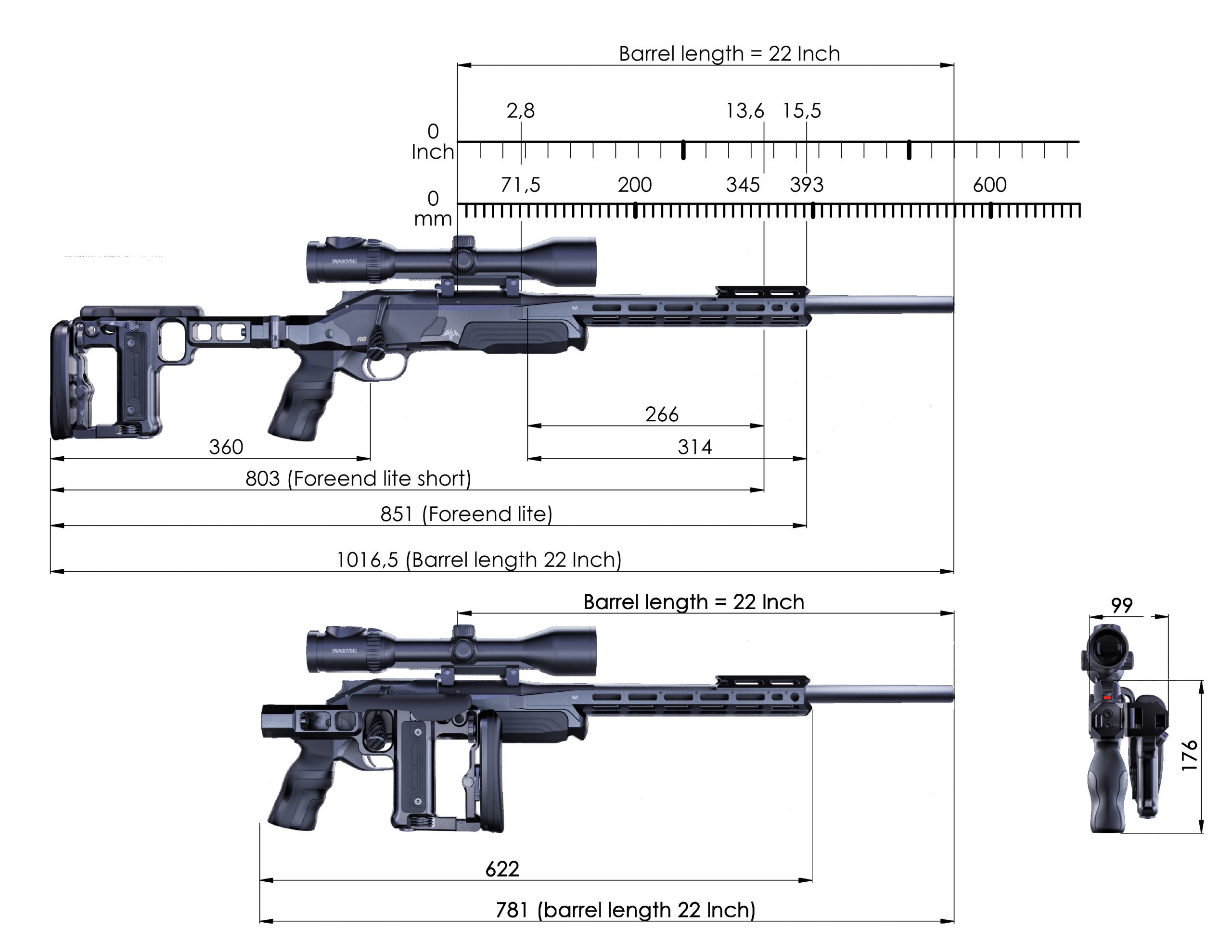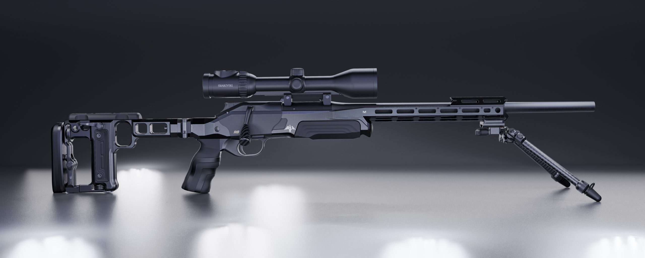 Either of the two available foreends is a separate piece attached to the chassis. Handguard Lite was made with maximum functionality and weight optimisation and features M-LOK™ interface on all 8 sides while ARCA Foreend on 6 sides as well as ARCA rail on the 6 o’clock. Both foreends feature QD sling swivel sockets at the very front, at 3 and 9 o’clock.