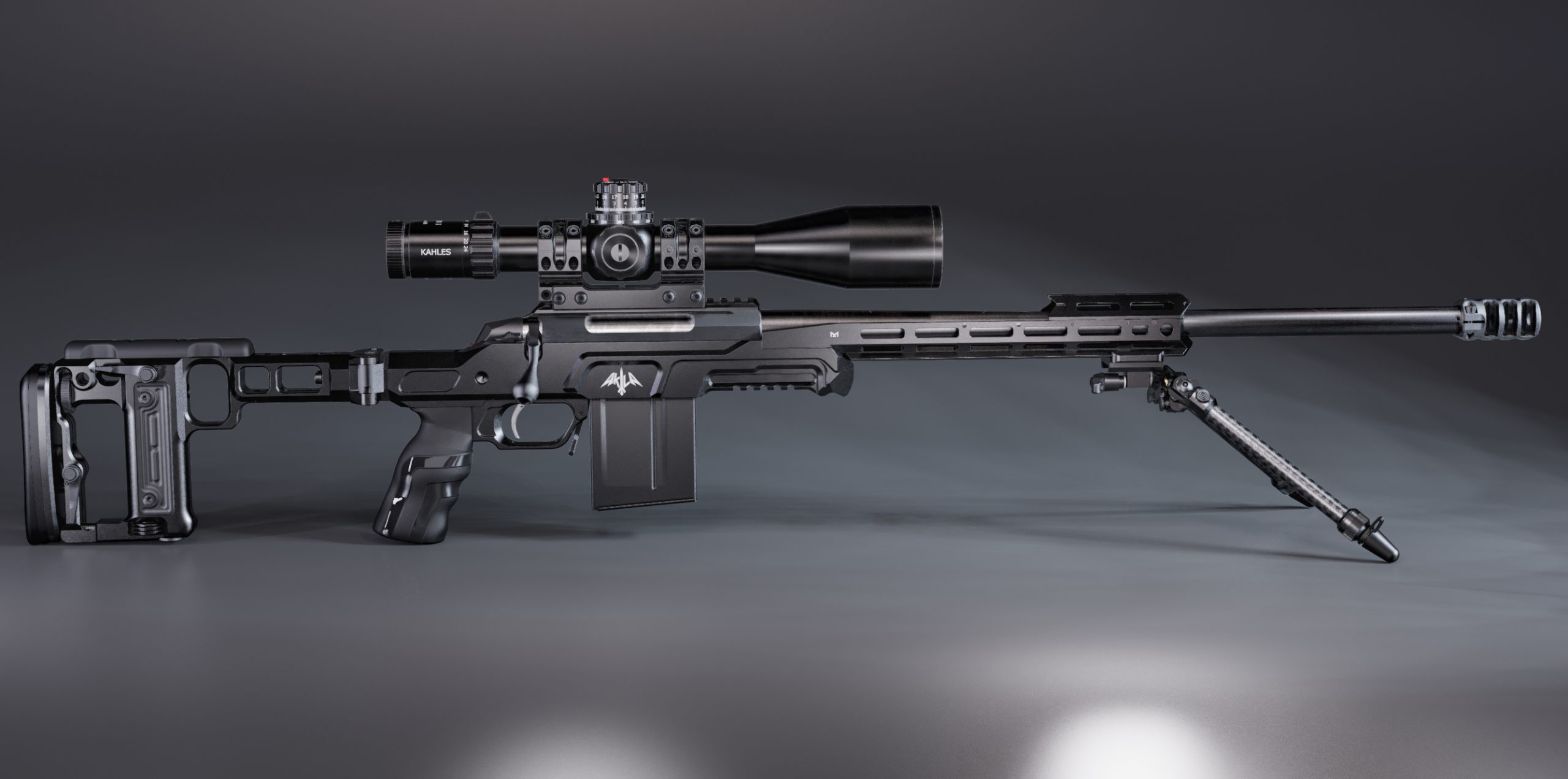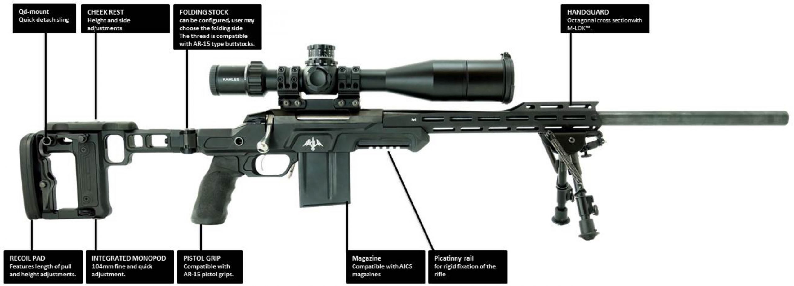 Both AKILA buttstocks are machined out of 7075 T651 aluminium billets and have a black hard coat anodized finish and features QD sling swivels sockets on both sides. Both buttstocks offer a possibility to adjust the cheek piece height and side, the length of pull, recoil pad height. Besides that Buttstock M features a built-in quick deployable and fine adjustable monopod and buttstock Lite has one MLOK™ slot to mount a monopod or a custom bag rider. The buttstock mounting point of the AKILA chassis is compatible with AR-15 receiver extensions, which will allow installing AR butt stocks. The buttstock folding can be user configured and folds to left or right sides of the chassis.